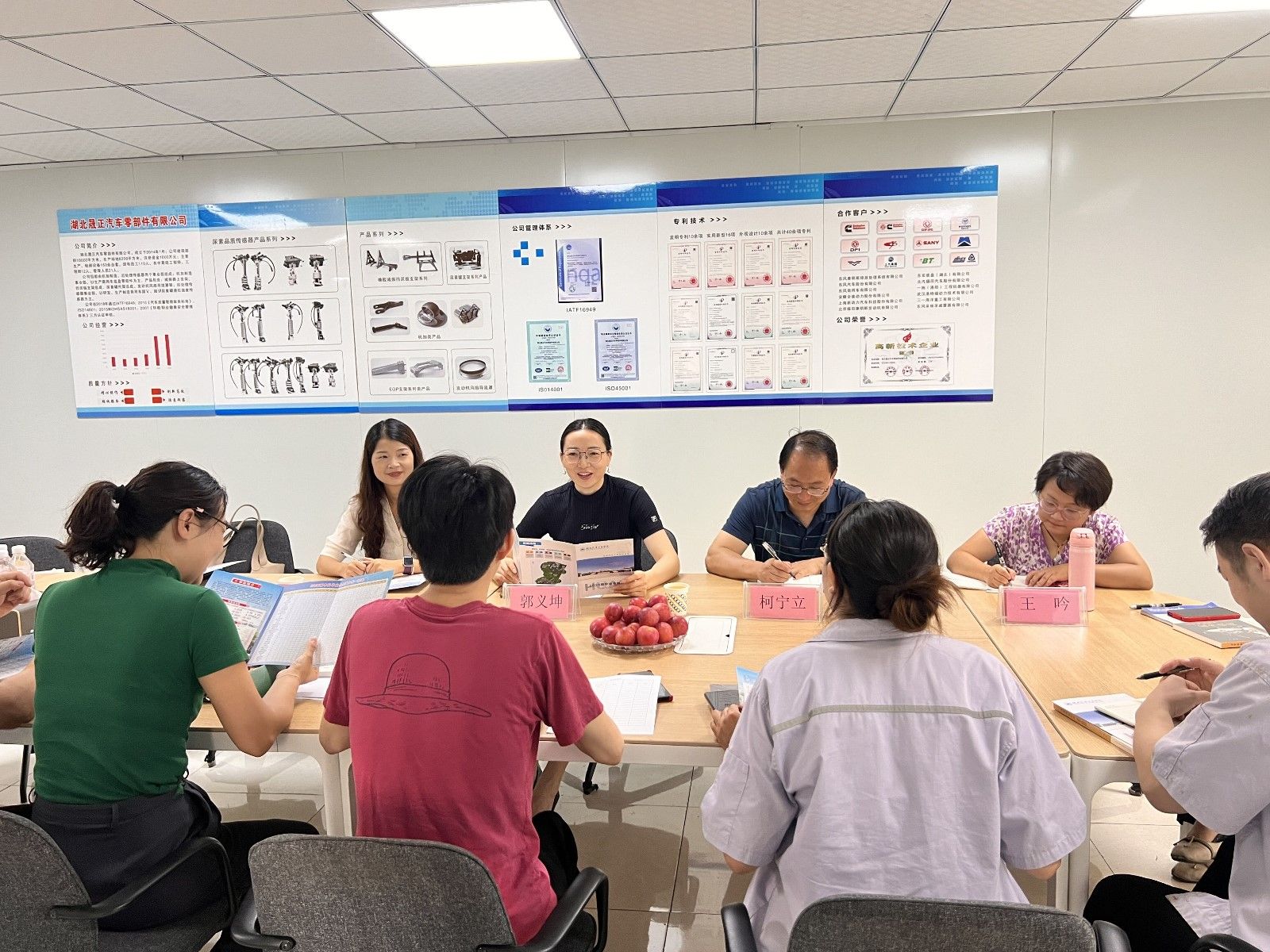 本网讯(文/图 魏院珍)8月23日上午,外语外贸学院党委书记郭义坤、副书记张倩等一行5人前往湖北晟正汽车零部件有限公司开展校友企业走访活动,看望6位校友并深化校企合作交流。湖北晟正汽车零部件有限公司副总经理刘庭杰、市场总监刘玉立(外语外贸学院1093-1班校友)热情接待走访团队。